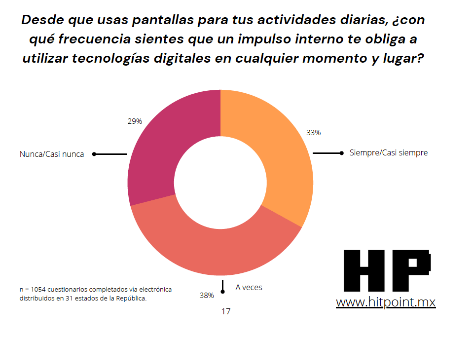 Un 33% dijo siempre o casi siempre siente que un impulso interno le obliga a utilizar tecnologías digitales en cualquier momento y lugar. Otro 38% dijo que esto le sucede a veces y el restante 29% dijo que nunca o casi nunca.