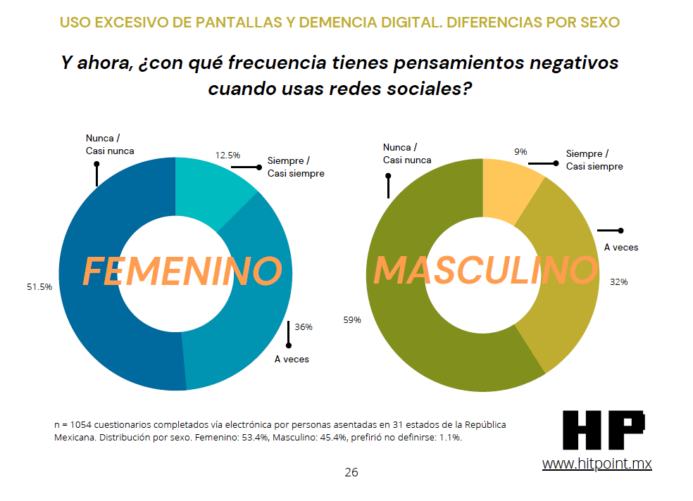 En ambos casos, los tienen con más frecuencia a veces, casi siempre o siempre cuando se les compara con los hombres. En el caso de internet, ellas tienen pensamientos negativos 37% de las ocasiones y 49% cuando usan las redes. En los hombres, 29% cuando se trata de internet y 41% al usar redes.