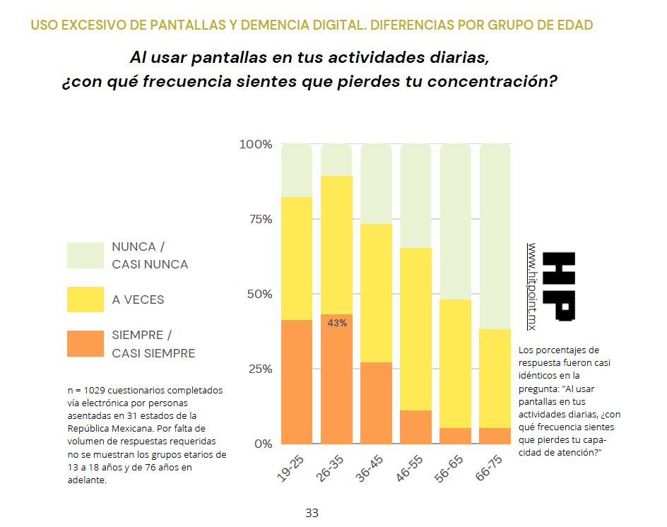 Los grupos de 19 a 25 años, así como el de 26 a a 35 años, afirmaron con mucho mayor frecuencia que casi siempre o siempre pierden su capacidad de concentración (41% en el primer grupo; 43% en el segundo) y atención (41% y 37%, respectivamente) al usar pantallas.
