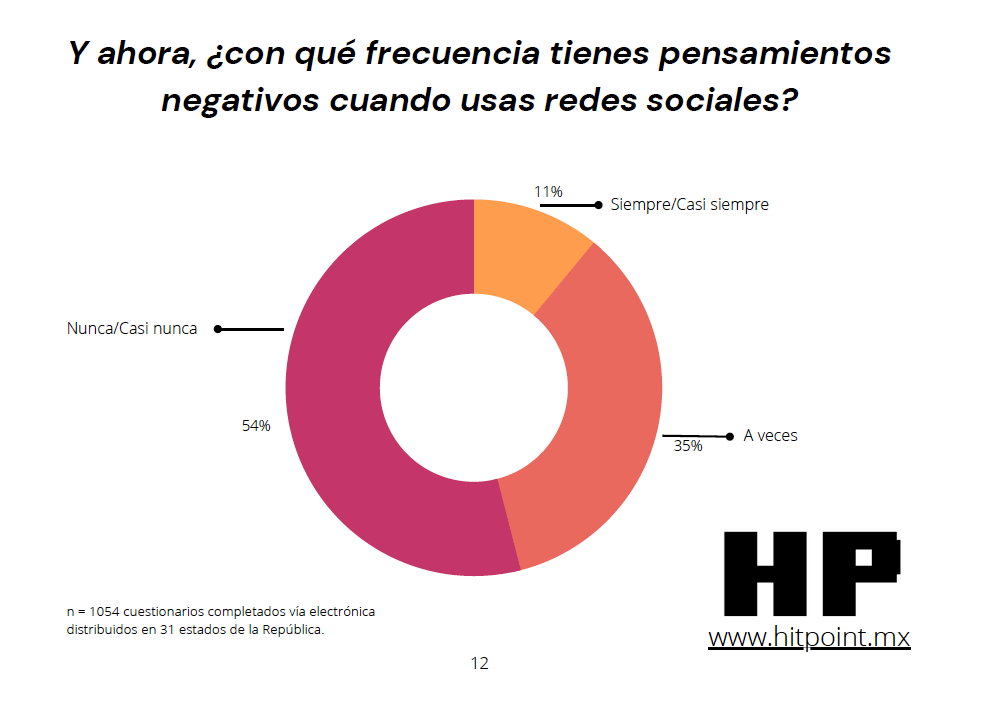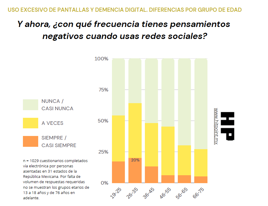 En las redes sociales la situación es más grave. El 44% de los mexicanos de 26 a 35 años a veces tiene pensamientos negativos cuando usa las redes, el mayor entre todos los abarcados en el estudio. En ese mismo grupo el 20% tiene pensamientos negativos siempre o casi siempre que usa las redes, el nivel más alto solo por arriba de los que tienen de 19 a 25 años (16.5% de las veces).
