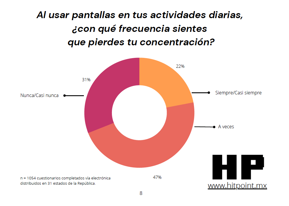 Una buena mayoría de los encuestados (47%) dijo que a veces pierde la concentración, pero el 22% dijo que esto le pasa siempre o casi siempre contra un 31% que dijo nunca o casi nunca.