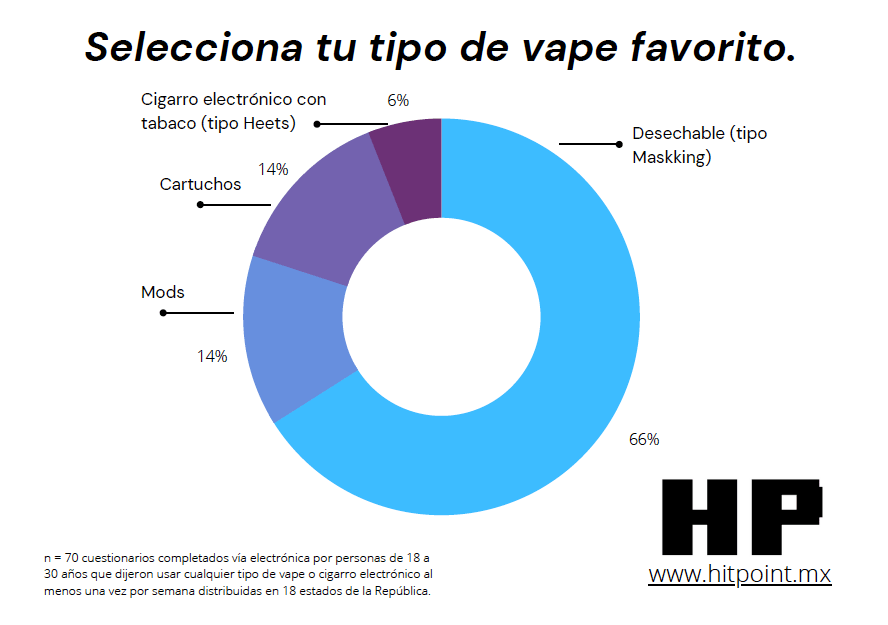 En HITPOINT decidimos investigar sobre el tema con un cuestionario digital contestado por jóvenes de 18 estados de la República con edades que fueron de los 18 a los 30 años que dijeron ser consumidores frecuentes de vape o cigarro electrónico (n = 70).