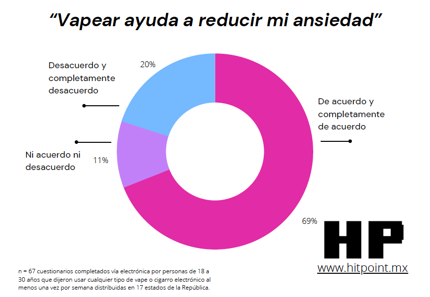 En donde prácticamente siete de cada diez estuvo de acuerdo fue en la ayuda que les ofrece el vape para reducir su ansiedad. En una pregunta relacionada indirectamente a este tema, un 15% de los encuestados dijo que tiene pensamientos negativos cuando pierde o no tiene su vaporizador a la mano.