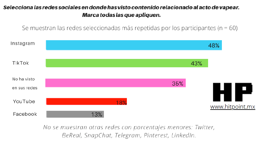Sobre los espacios digitales en donde han visto estos contenidos sobre vapeo destacan por mucho Instagram (48%) y Tiktok (43%) sobre todas las demás redes. En el conteo de frecuencias, en comparación, YouTube apenas sumó 18%.