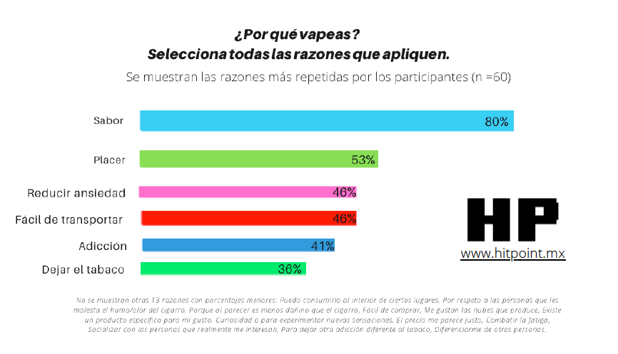 De manera muy relevante, más de la mitad nos dijo que usan el cigarro electrónico porque quieren y no para dejar el consumo de tabaco. Este punto es crucial: las compañías que ofrecen estos productos lo publicitan como una opción para dejar de fumar cigarro tradicional, pero la realidad es que un grupo considerable de jóvenes mexicanos usa el vaporizador por sus cualidades innatas.