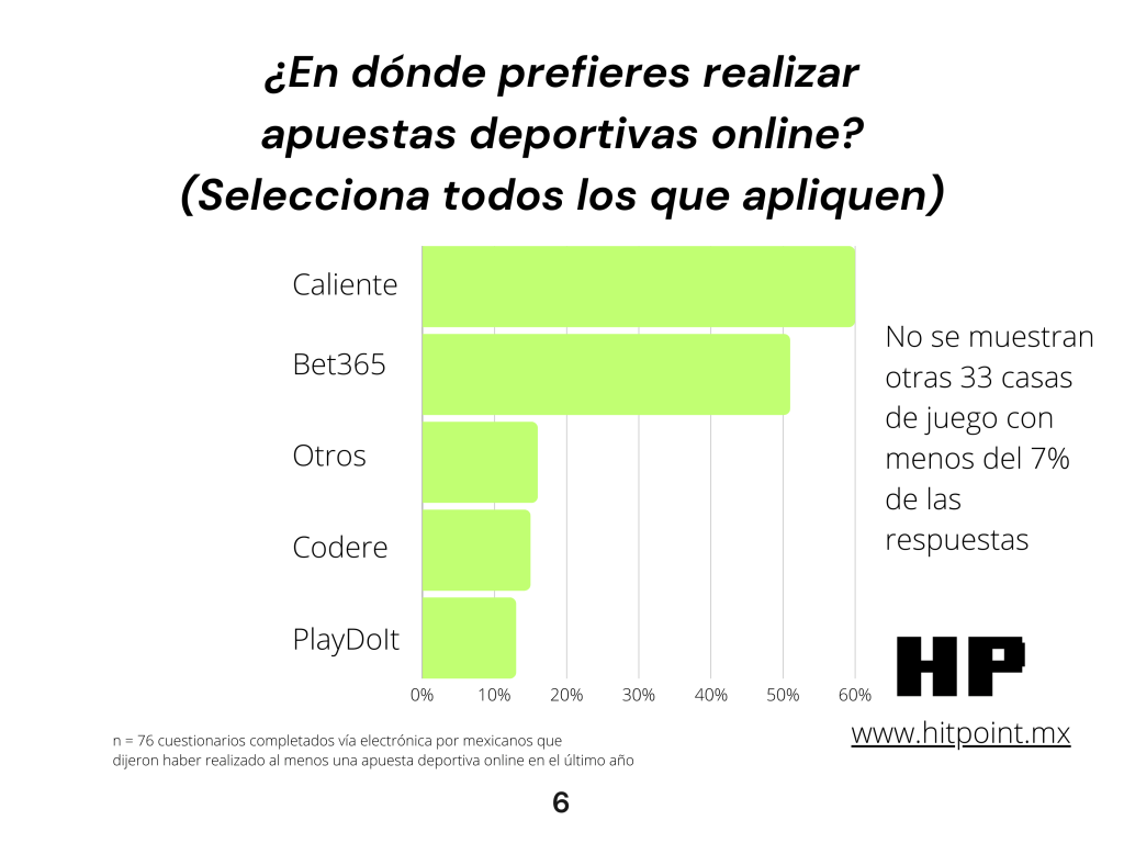 En cuanto a las casas de apuesta deportiva más populares en México, por mucho las dos respuestas más comunes fueron Caliente y Bet365, seguidas muy por detrás de Codere y PlayDoIt.