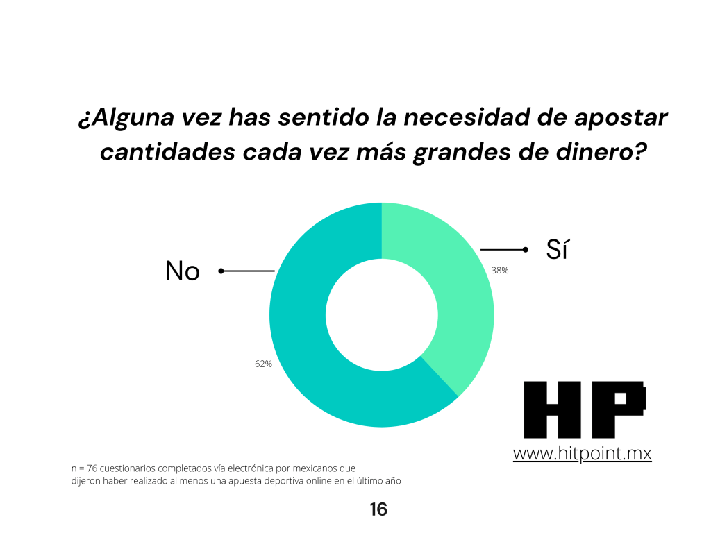 Sin mayor sorpresa, la enorme mayoría opinó que México debe seguir aceptando las apuestas deportivas digitales para hacer más fuerte nuestra economía. Pero de manera preocupante, casi 40 por ciento dijo que ha sentido la necesidad de apostar cada vez cantidades más grandes de dinero.