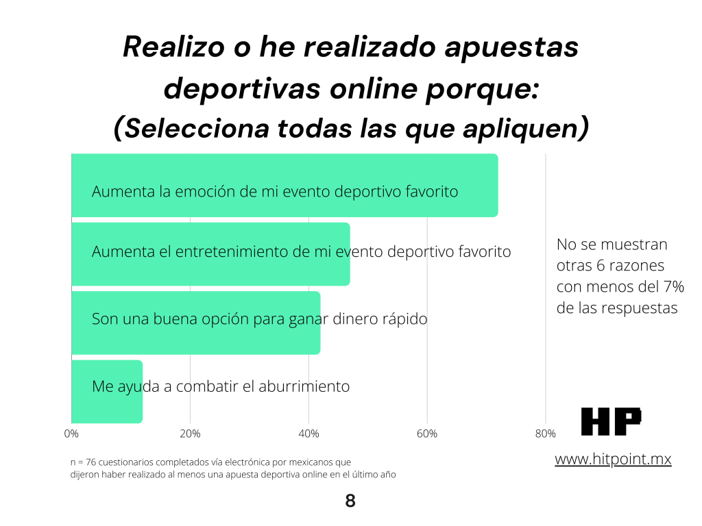 2) Las razones más comunes para realizar este tipo de apuestas en México son a) aumentar la emoción de su evento deportivo favorito, b) aumentar el entretenimiento del mismo y c) para ganar dinero rápido.