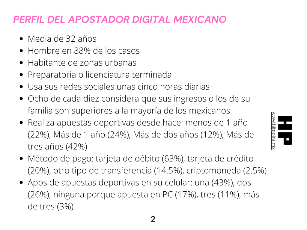 1) Los hombres de unos 30 años que tienen trabajo y dedican en promedio unas cinco horas diarias a sus redes sociales conforman los rasgos más comunes de los apostadores deportivos online en México.