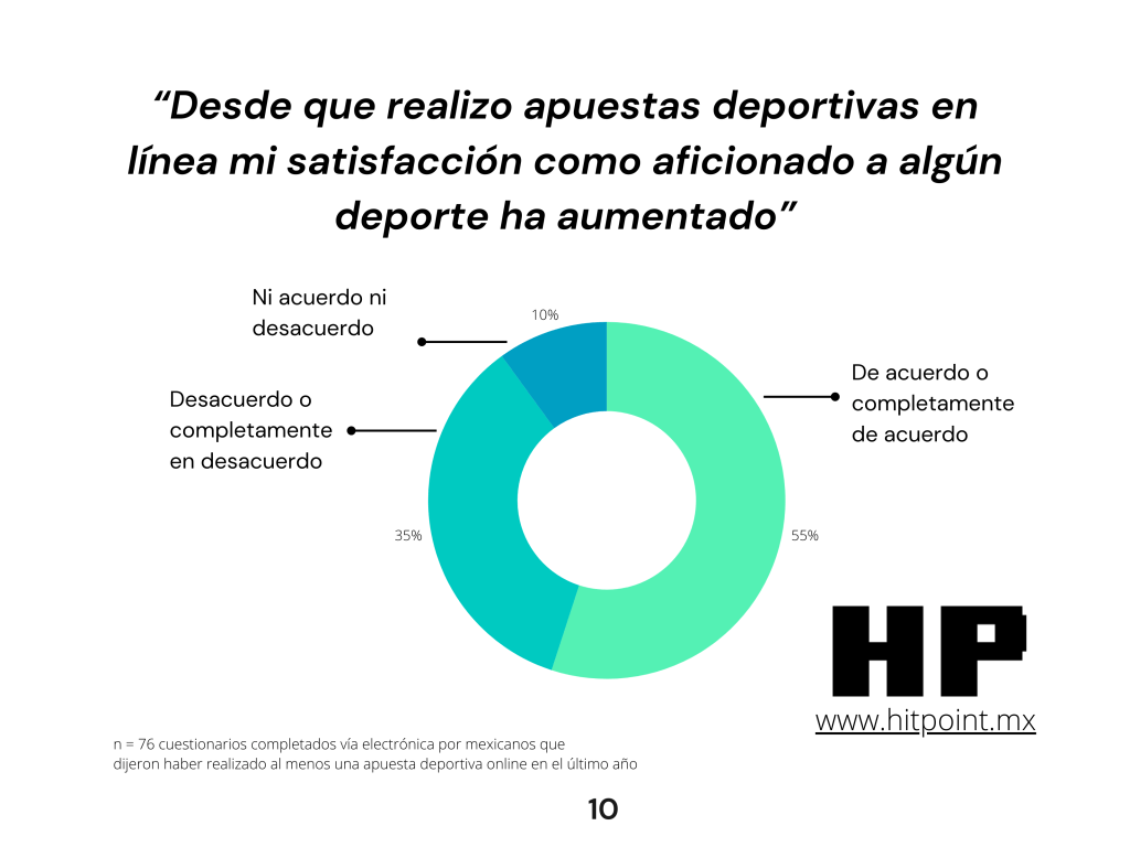 En cuanto al entretenimiento y satisfacción ligados al hecho de apostar en línea en algún partido, casi la mitad dijo que desde que juega dinero de esta forma su satisfacción como aficionado a algún deporte ha aumentado. Esto representa un nuevo paradigma que debe ser estudiado a profundidad, pues el fenómeno es relativamente nuevo en México.
